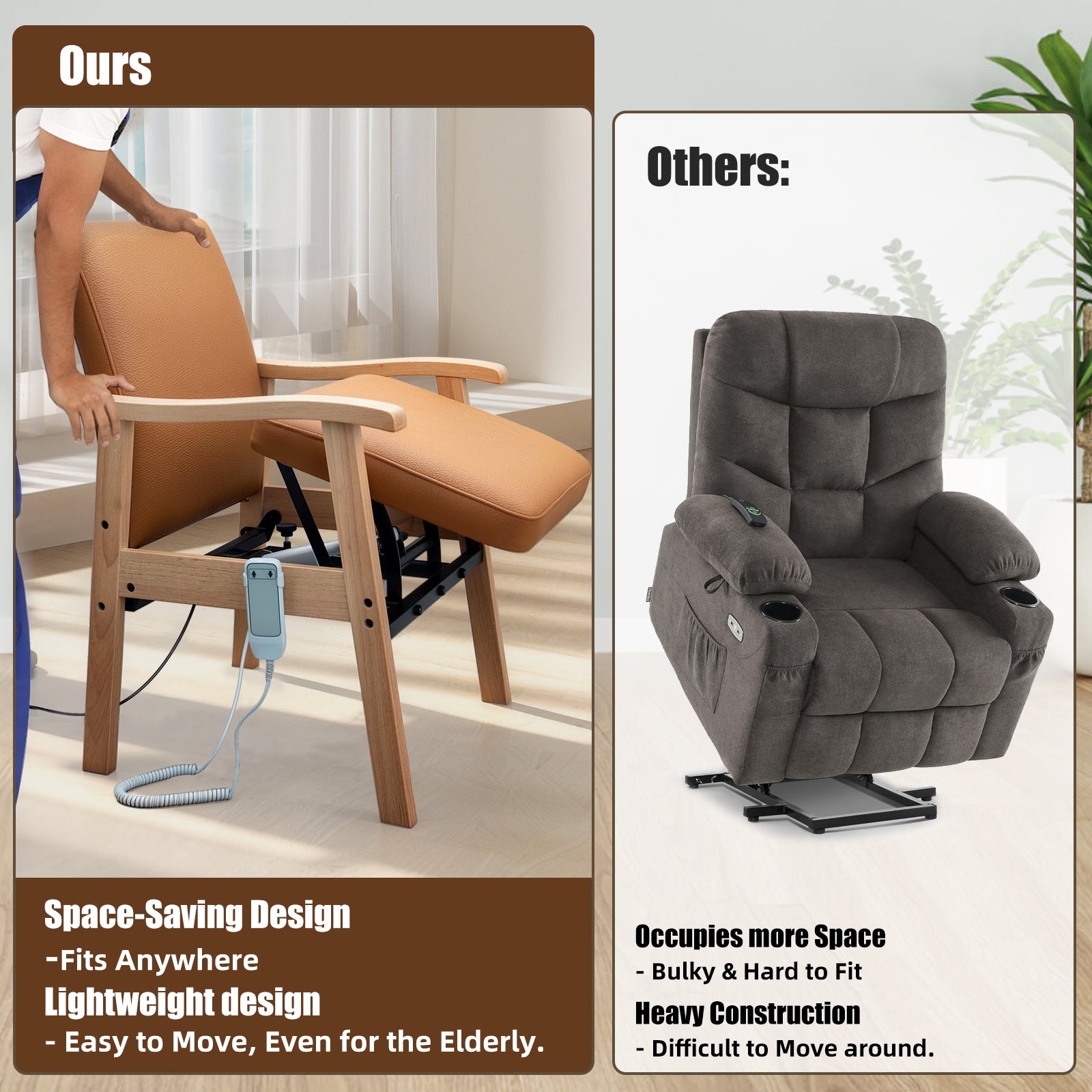 Seniors can benefit from the chair’s lift assistance to maintain independence and reduce fall risk.