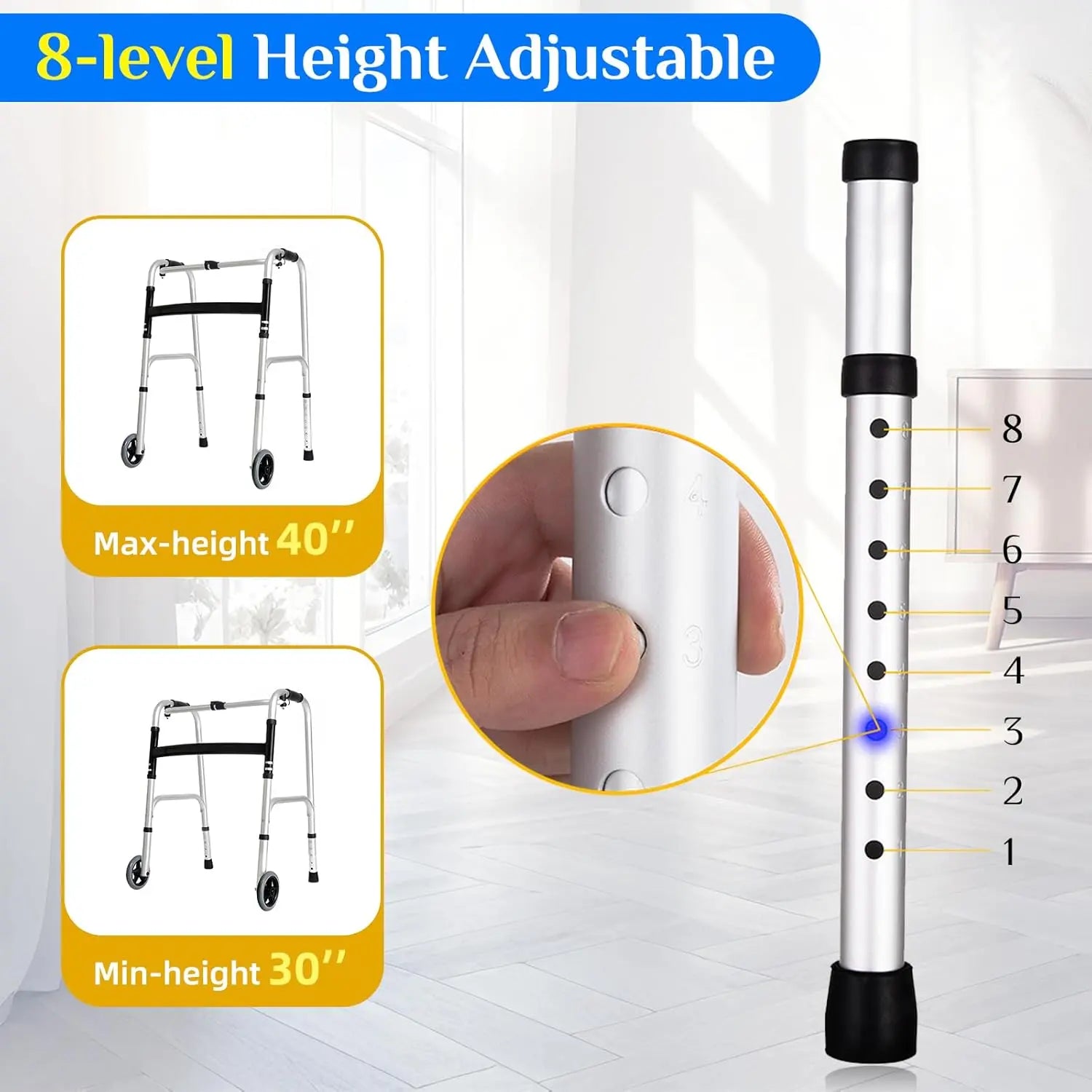 Easily adjust the walker from 31" to 38" with a simple snap-button system. Perfect for users of varying heights, ensuring a comfortable and safe walking experience.